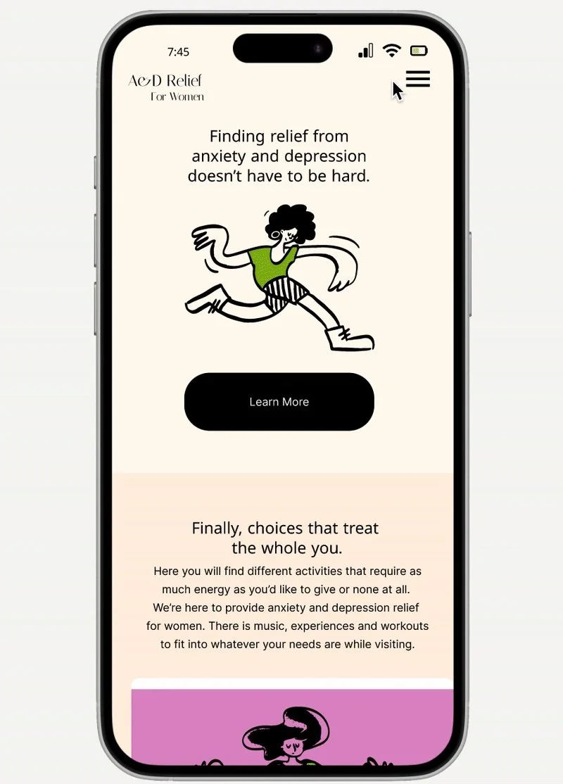A digital platform to help women find temporary relief from anxiety and depression using online activities.