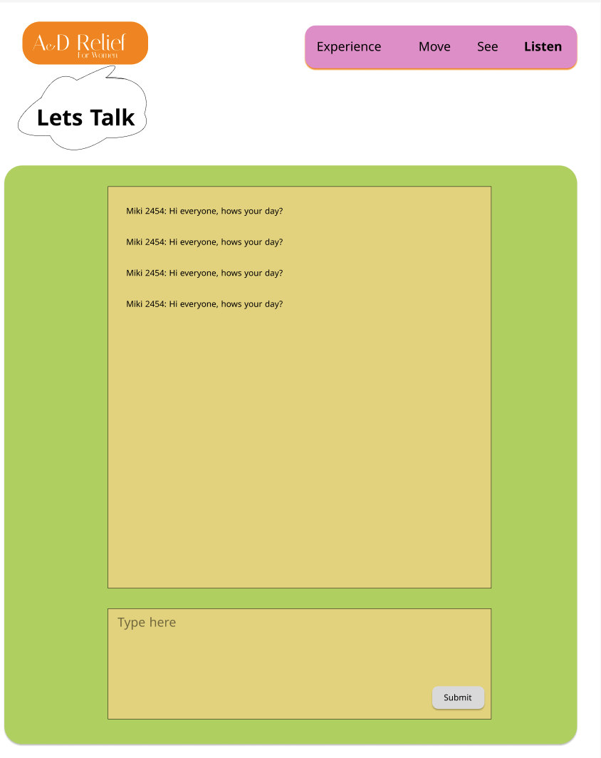 We need more user feedback. Due to time constraints, we weren’t able to continue testing. We’d like to explore the implementation of an AI-powered chat feature, similar to a therapist interaction. Lastly, we would iterate on the listen and see pages.
